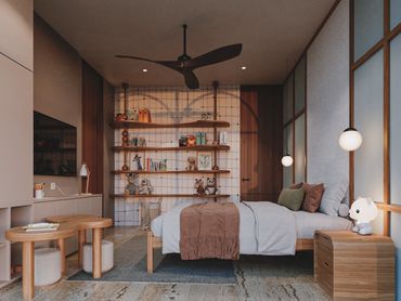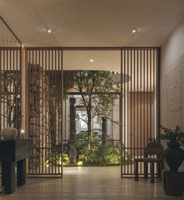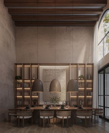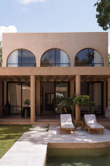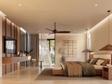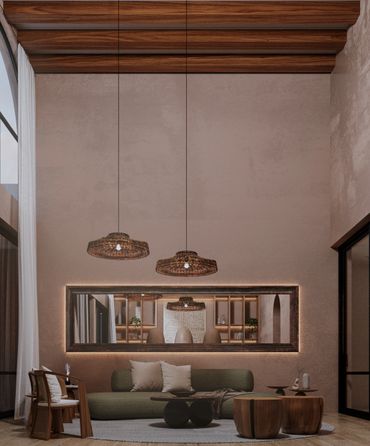 Los acabados se inspiran en la materialidad y los colores del paisaje yucateco: piedra, chukum y madera, en una paleta de tonos cálidos, terrenales y sobrios, que aportan elegancia y serenidad a los espacios.